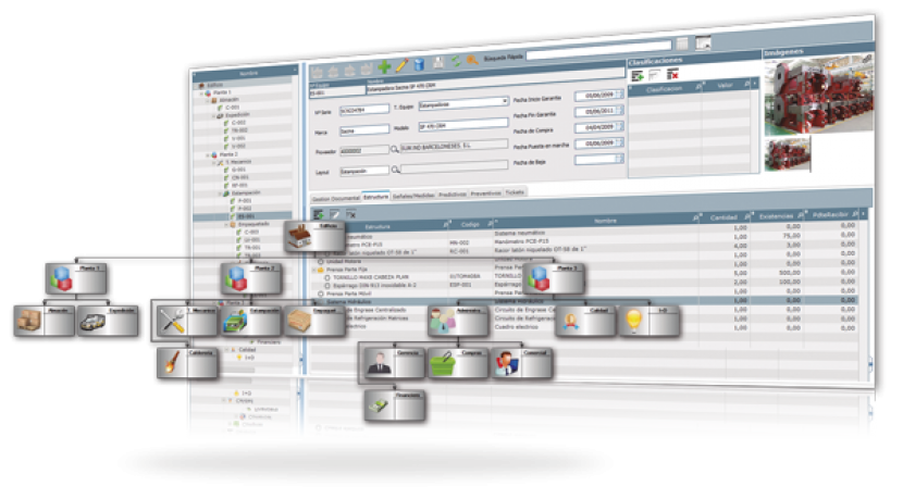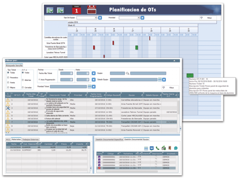 Definición de los Mantenimientos preventivos, predictivos y correctivos (avisos o tickets). Planificación y consulta de OTs muy sencilla y ágil. Por cada OT podremos imputar Mano de Obra, Material y Subcontratación, dándonos luego, en la consulta, una visión muy completa de cada OT.
