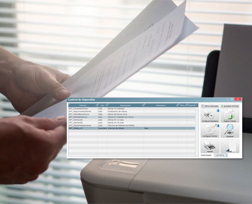 A través de nuestra herramienta OnyxReports nos da la opción de configurar visualmente los informes según nuestras necesidades. Podemos acceder a esta opción desde diferentes áreas del ERP, pulsando en el botón superior con forma de impresora.