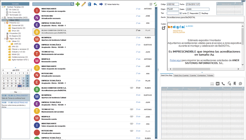 Toda la información queda almacenada en este módulo y hace fácil su seguimiento y revisión. Organiza tareas, notas, emails, reuniones, documentos, etc.